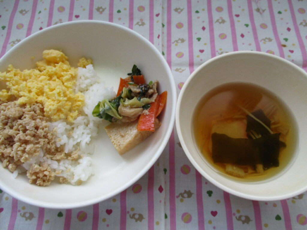 <今日の献立>とりそぼろごはん・厚揚げのオイスターソース炒め・すまし汁