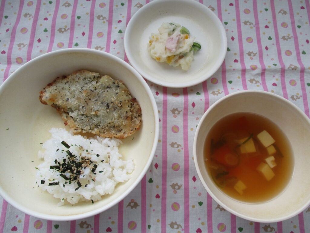 <今日の献立>ごはん・ふりかけ・たらの香草パン粉焼き