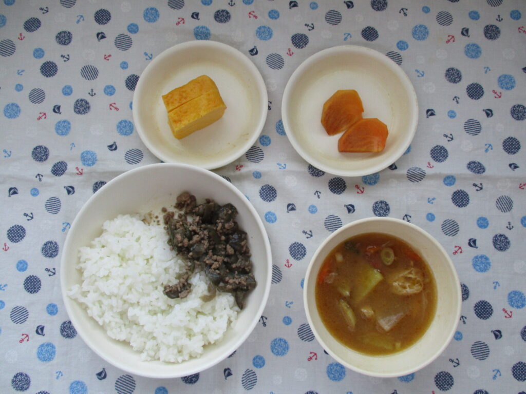 <今日の献立>ごはん・芋汁・ナスとピーマンのそぼろ炒め・