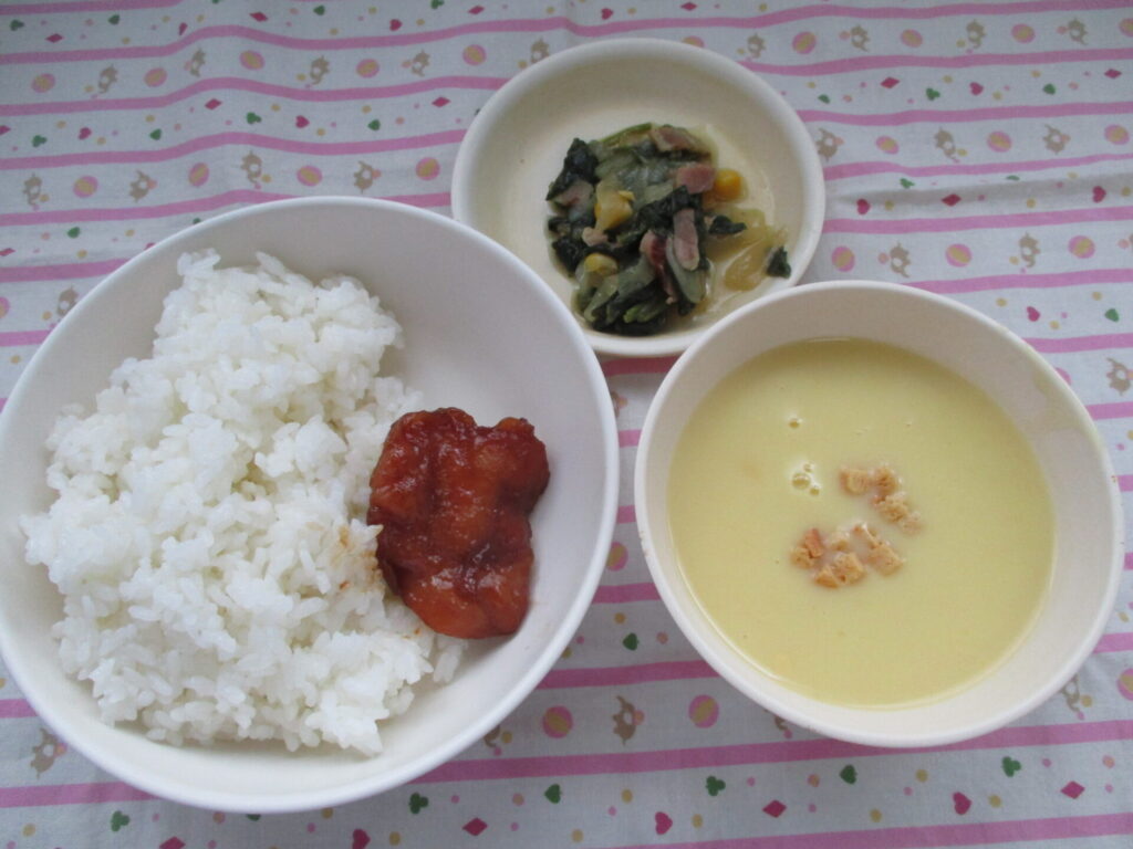今日の献立★ごはん、照り焼きチキン、ポパイソテー、コーンスープ