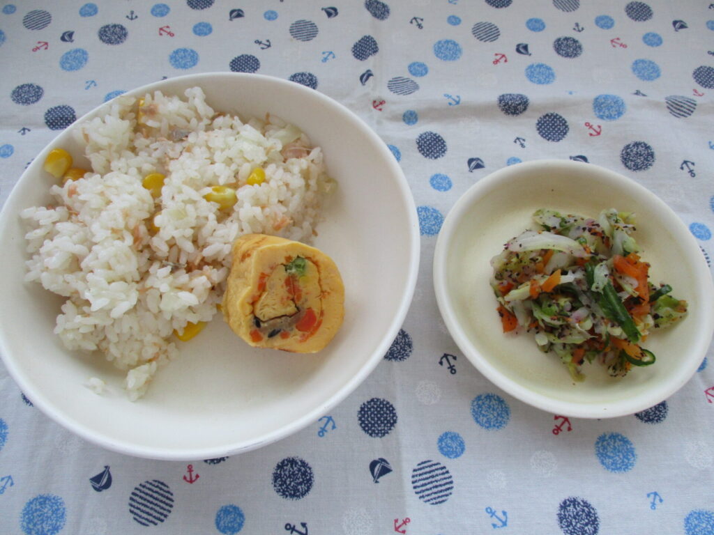 今日の給食は、鮭とコーンの炊き込みご飯、キャベツのゆかり和え、花五目卵巻きです🍳