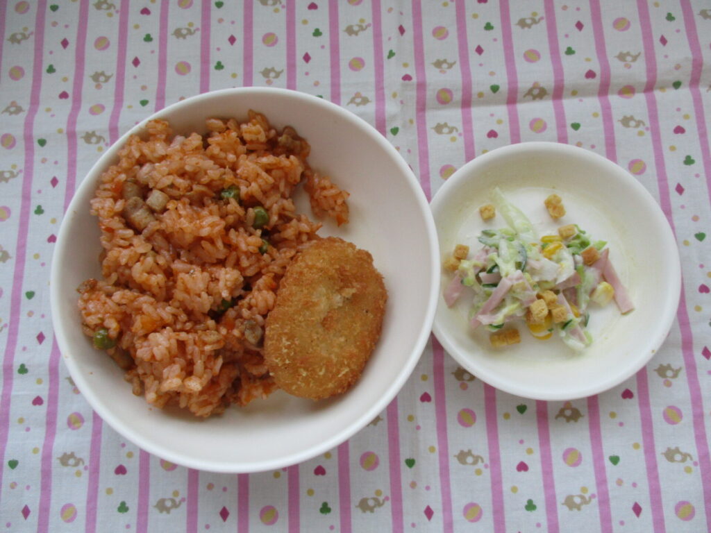 今日の献立☆チキンライス、コロッケ、シーザーサラダ
