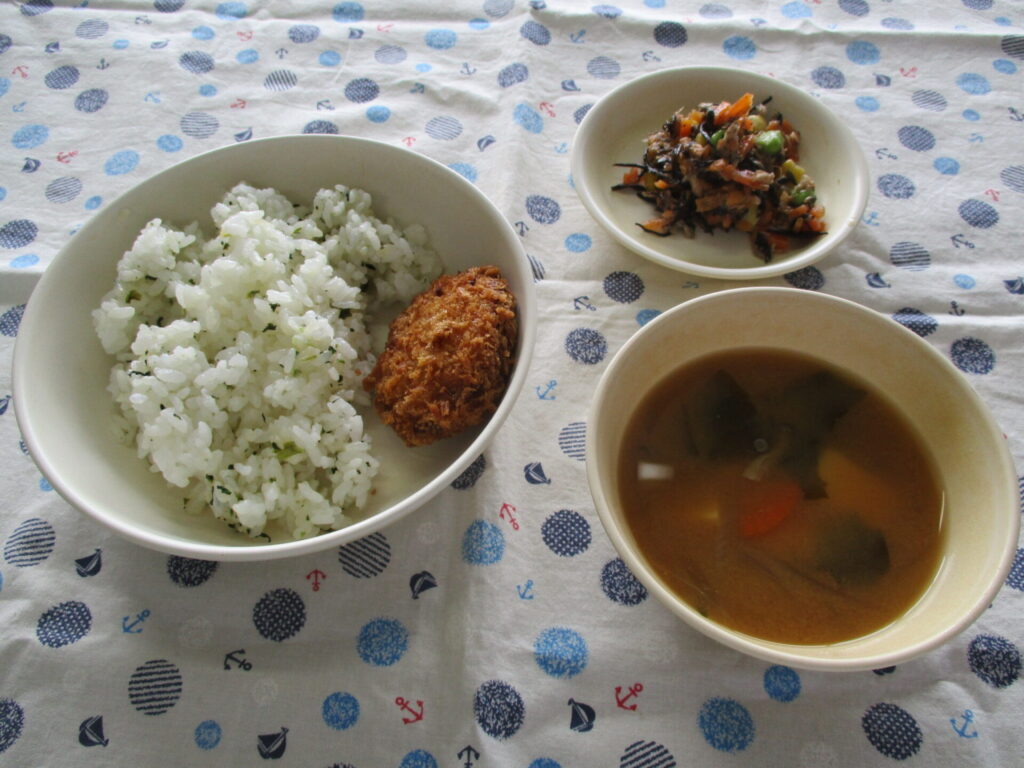 今日の献立>菜飯、鮭と野菜のカツ、ひじきサラダ、みそ汁