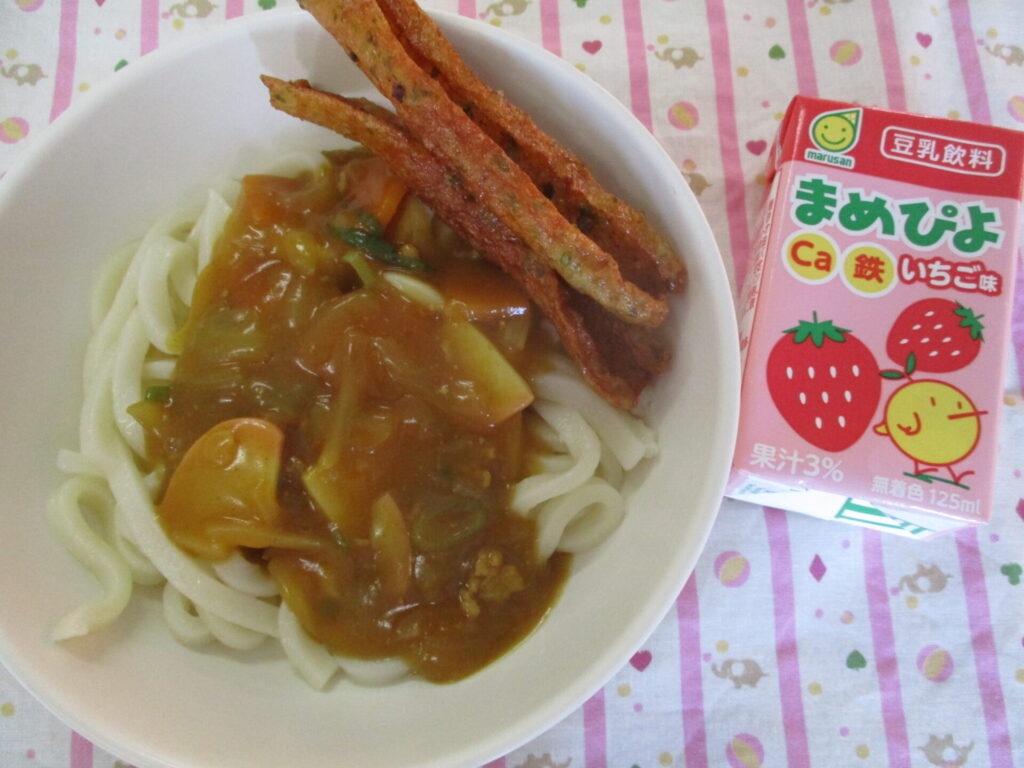 今日の献立>カレーうどん・ちくわの磯辺揚げ・まめぴよいちご味