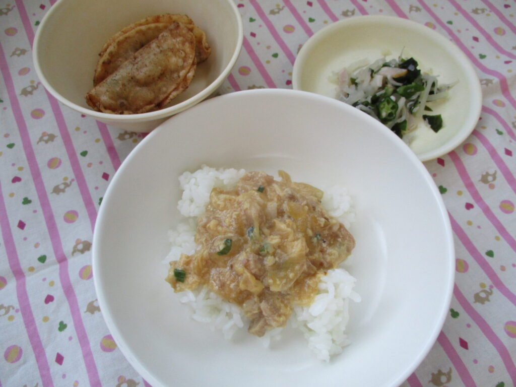 〈今日の給食〉親子丼・揚げ餃子・わかめの酢の物