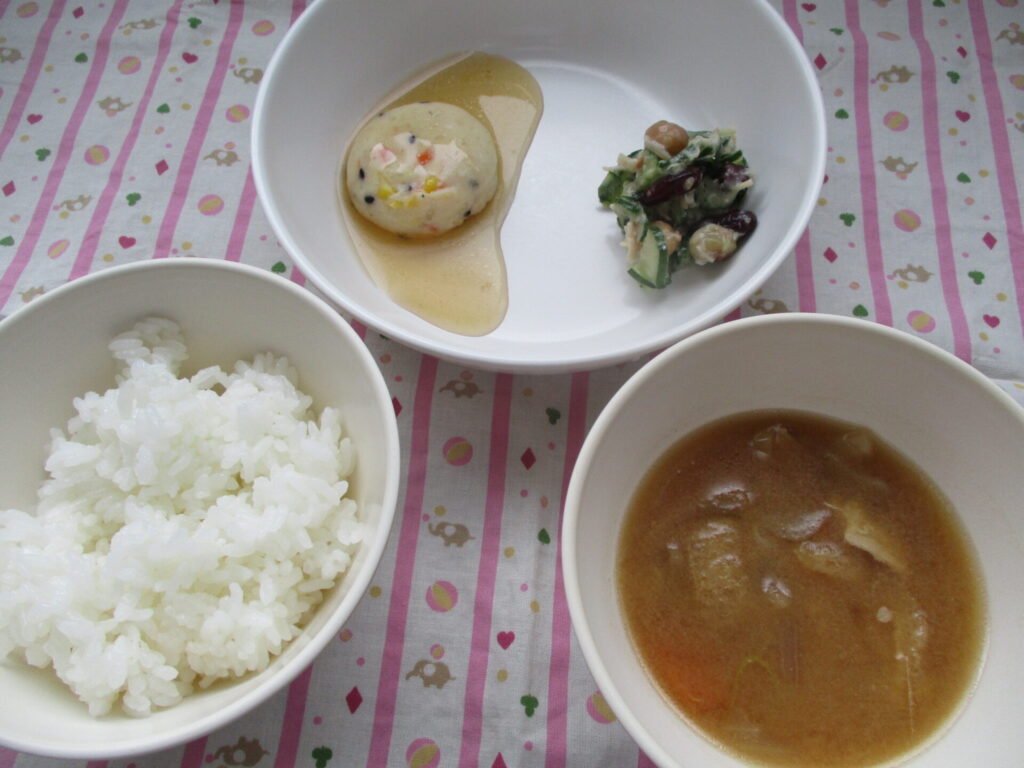 <今日の献立>ごはん・豆腐のふわふわ・キュウリとささみのサラダ・豚汁