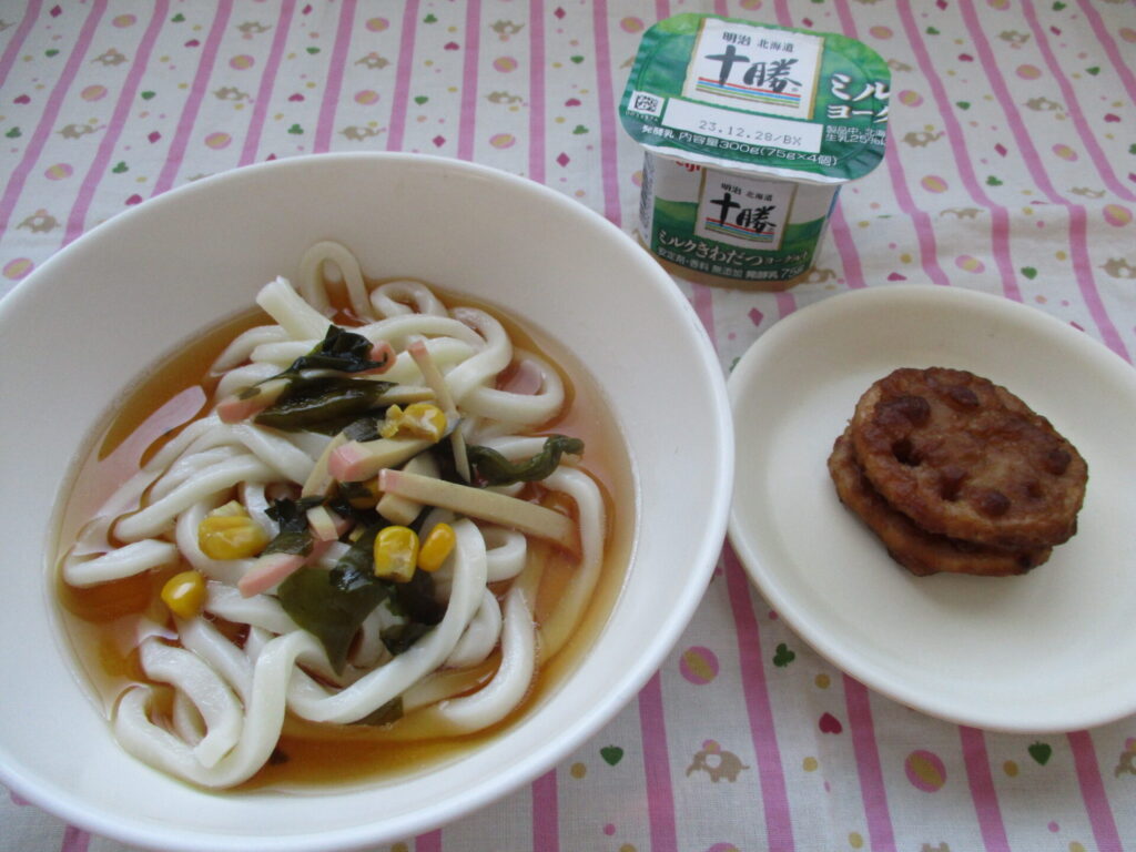今日の献立>かけうどん・れんこんの挟み揚げ・ヨーグルト