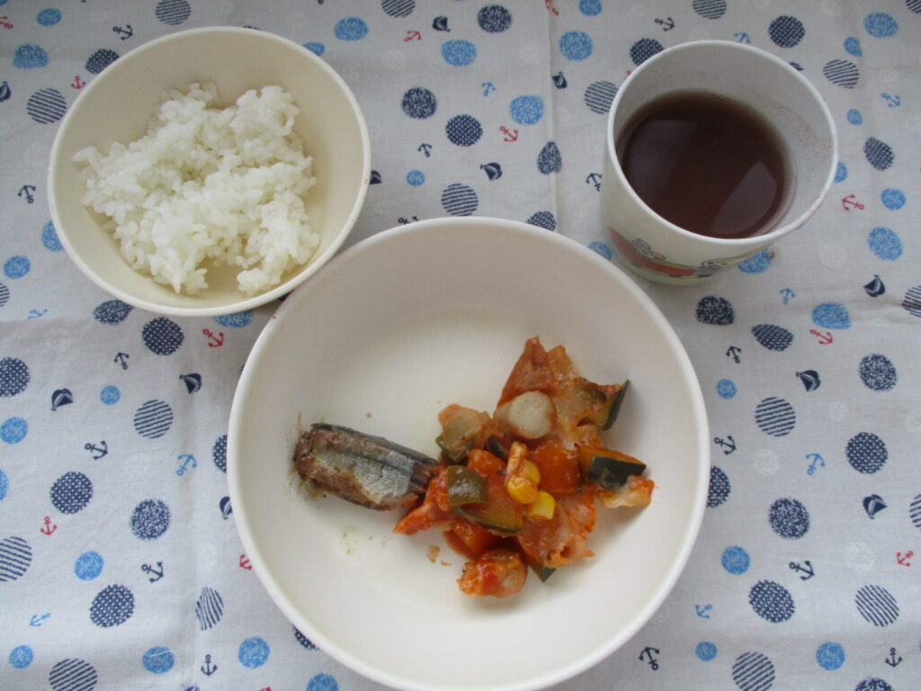〈今日の給食〉ご飯・さんまのおかか煮・かぼちゃのコロコロピザ・お汁粉