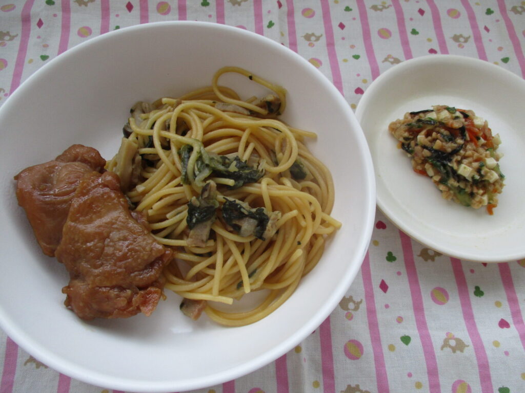 <今日の献立>和風キノコスパゲティ・照り焼きチキン・納豆サラダ