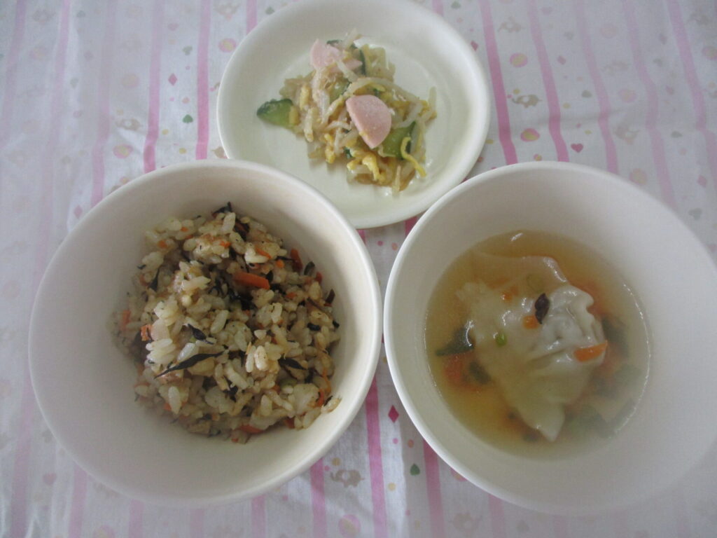 今日の献立>ひじきのまぜごはん・もやしの中華和え・ワンタンスープ
