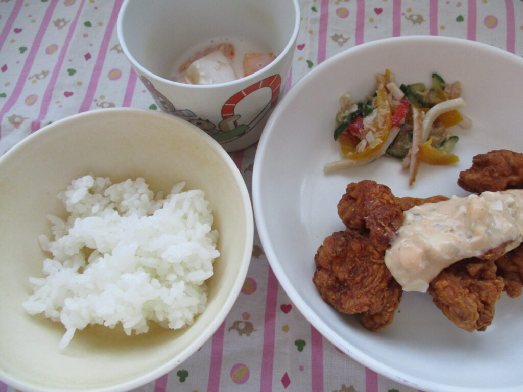 <今日の献立>ごはん・チキン南蛮・野菜のマリネ・フルーツヨーグルト