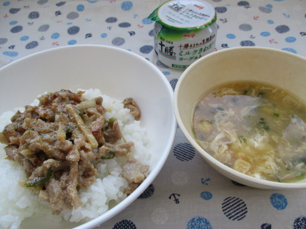 <今日の献立>チンジャオロース丼・中華風コーンスープ・ヨーグルト