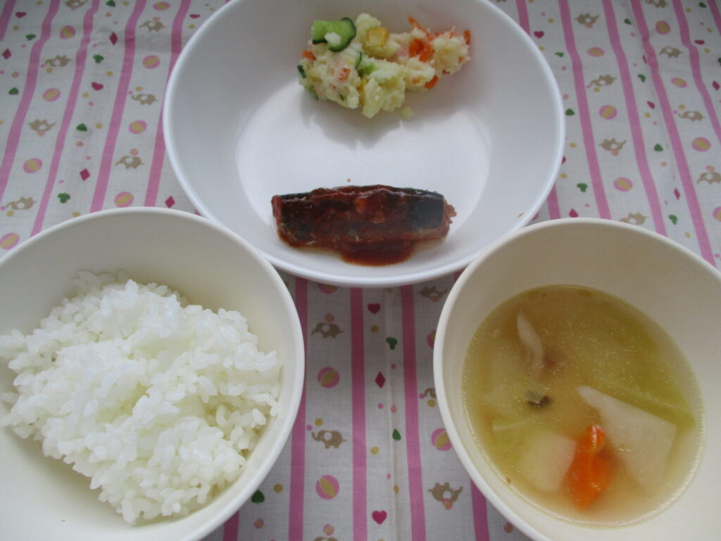 <今日の献立>ごはん・いわしのトマト煮・ポテトサラダ・ポトフ