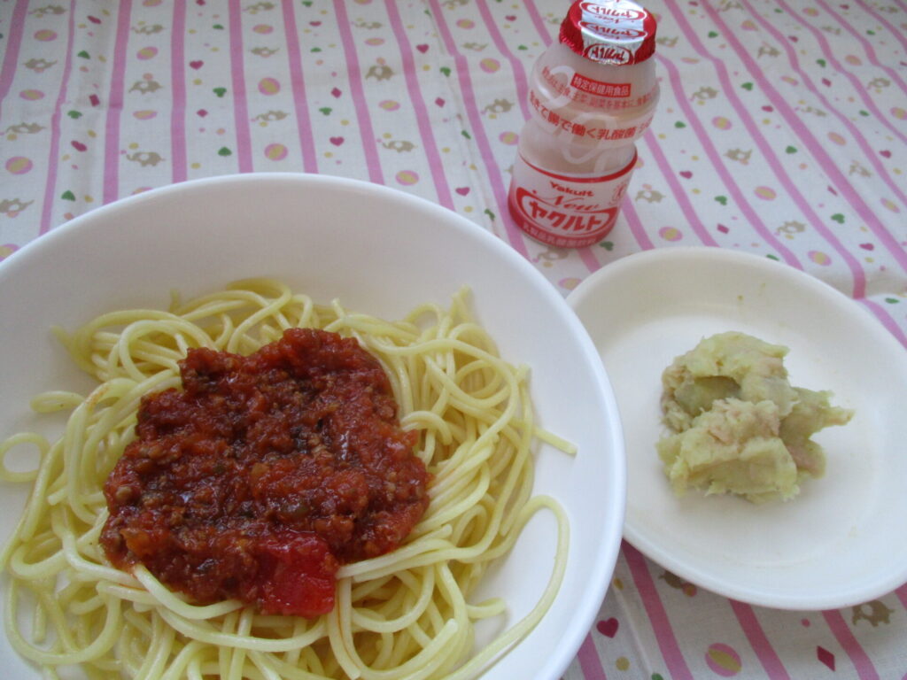 <今日の献立>ミートスパゲッティ・さつまいものカレーマヨサラダ・ヤクルト