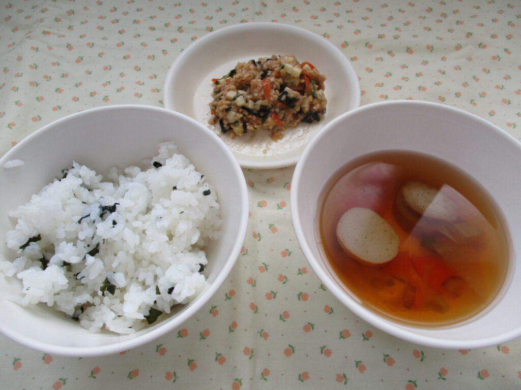 <今日の献立>わかめごはん 納豆サラダ いわしのつみれ汁