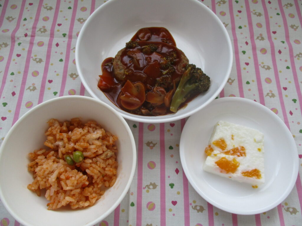 〈今日の給食〉チキンライス・デミグラスソースハンバーグ・牛乳寒天