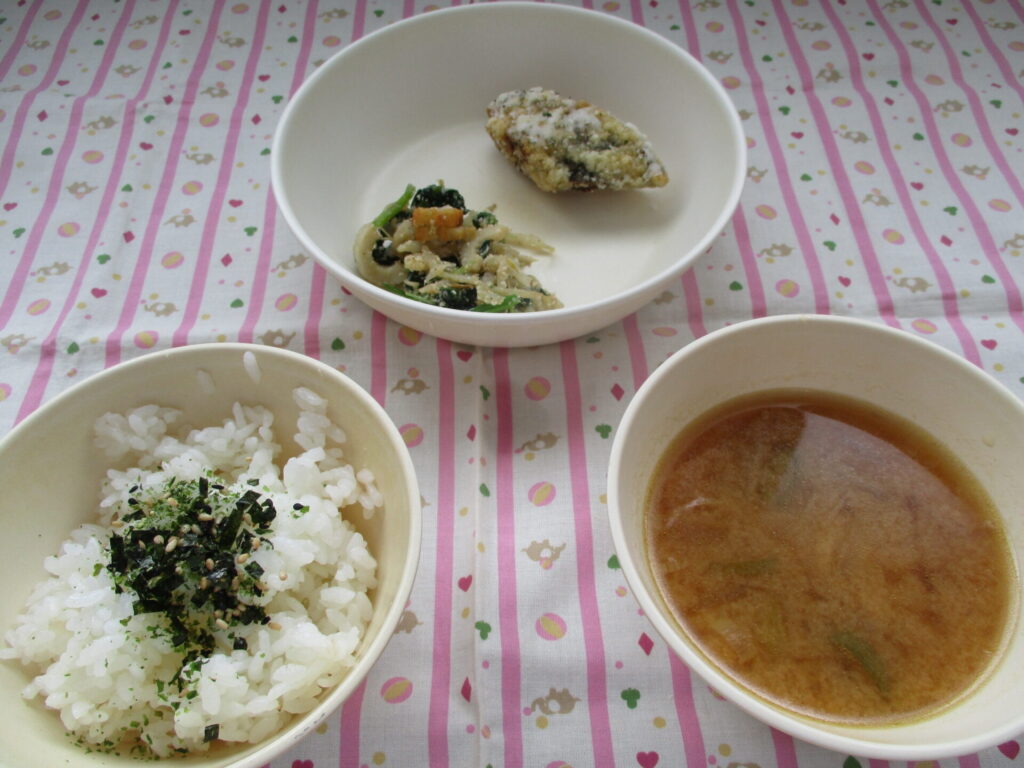 今日の給食は、和食メニューでおかずが3品でした。