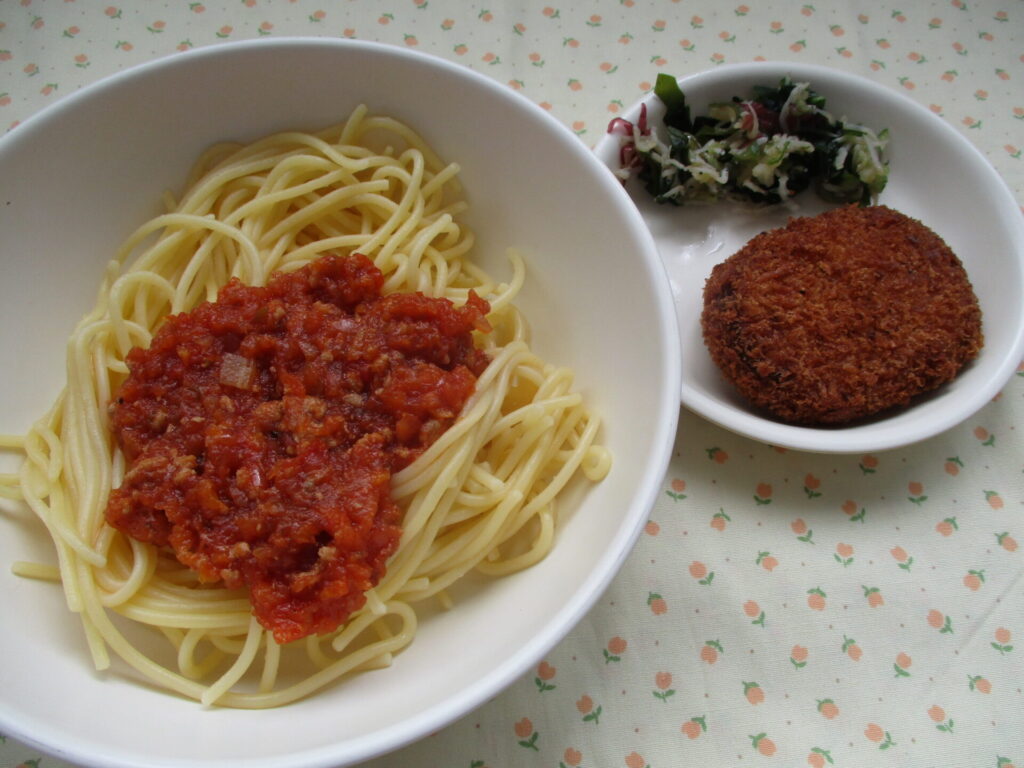 <今日の献立>ミートソーススパゲッティ・和風サラダ・コロッケ