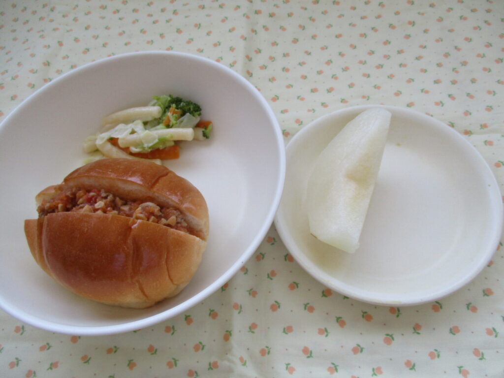 と人参、セロリをトマト味で煮込んだ具をロールパンに挟んであります。