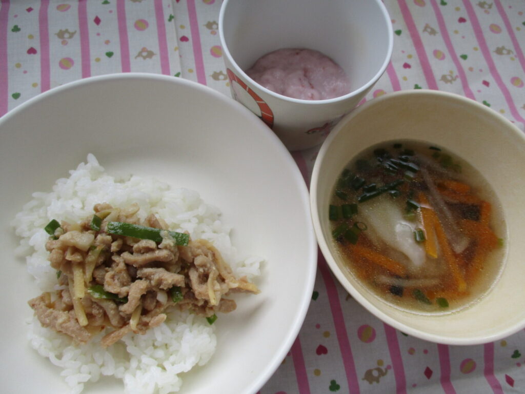 チンジャオロース丼・ワンタンスープ・フルーチェ