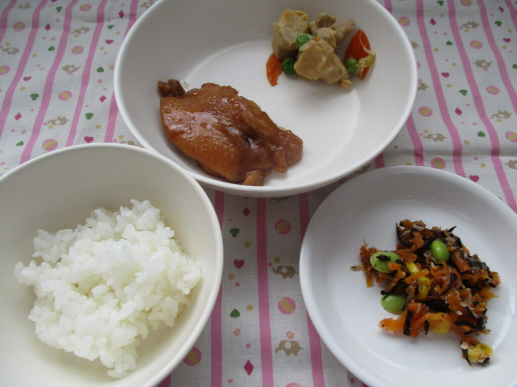 <今日の給食> ご飯、照り焼きチキン、高野豆腐の炒り煮、ヒジキサラダ