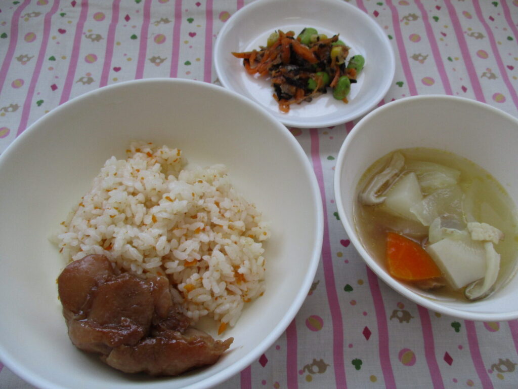 <今日の献立>にんじんピラフ・照り焼きチキン・ひじきのサラダ・ポトフ