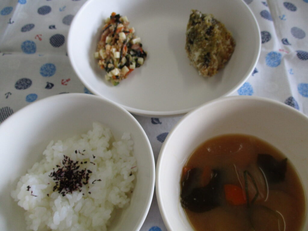 (今日の献立)ゆかりご飯・あじのカレー揚げ・納豆サラダ・みそ汁