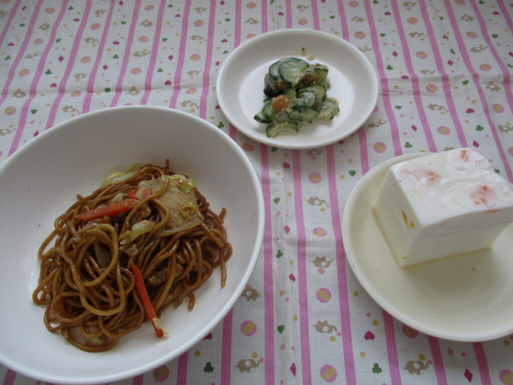 <今日の給食> 焼きそば・きゅうりとささみのサラダ・牛乳寒天
