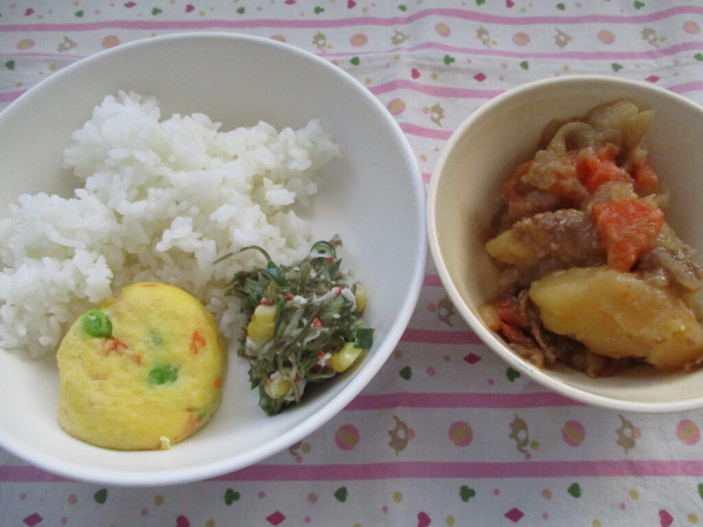 <今日の献立>ごはん・肉じゃが・刻み昆布のサラダ・卵と豆腐のしんじょ