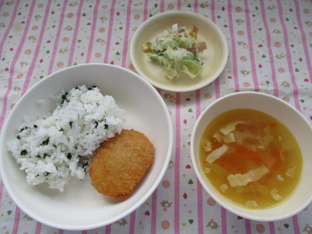 今日の献立>わかめごはん、コロッケ、コールスロー、野菜スープ