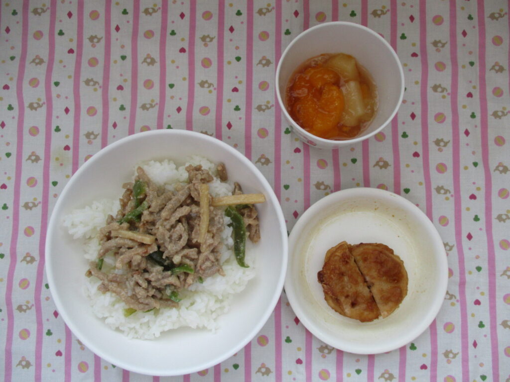 <今日の献立>チンジャオロース丼・れんこんのはさみ揚げ・フルーツゼリー