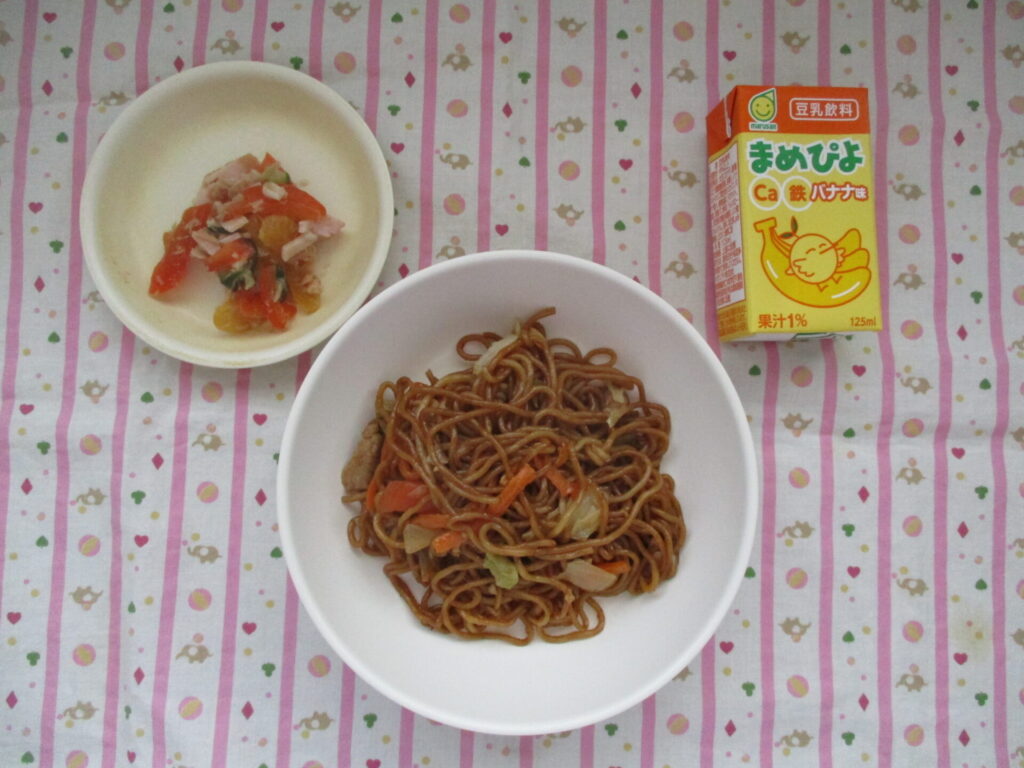 今日の献立☆焼きそば、野菜のマリネ、まめぴよ