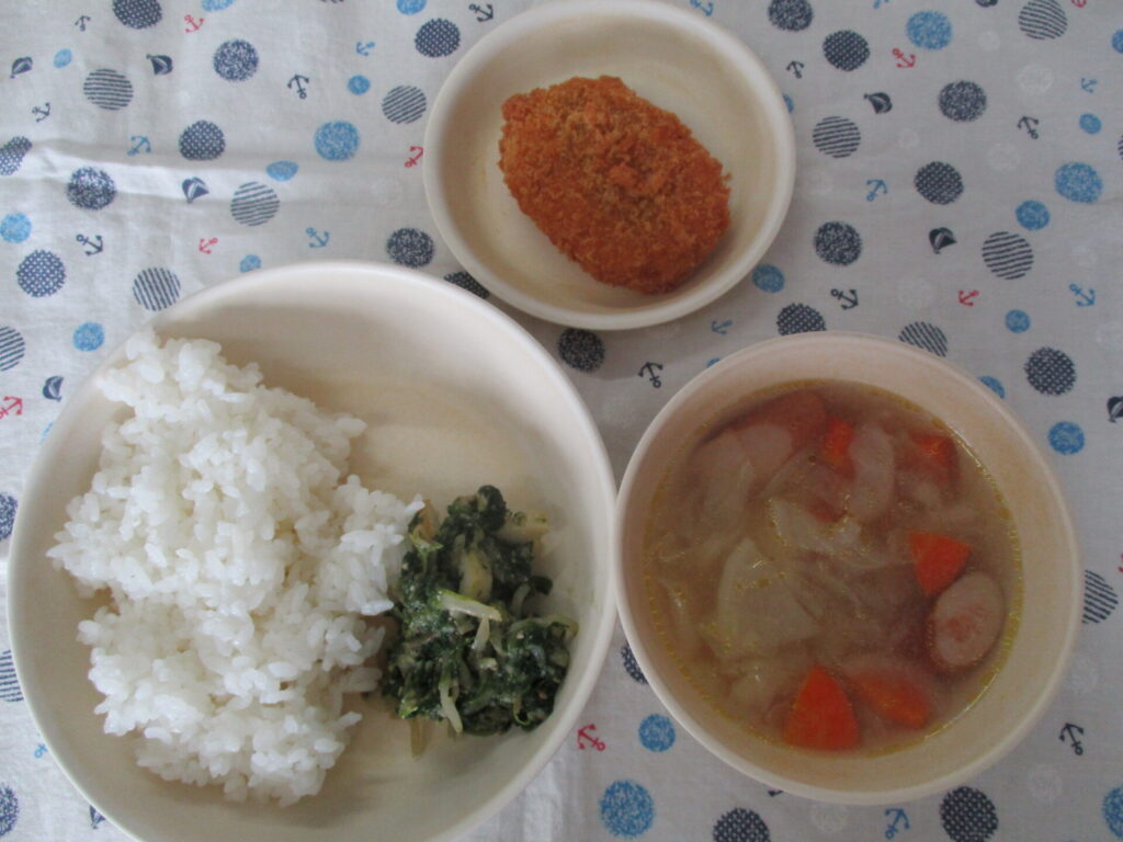 今日の献立>ごはん、かぼちゃコロッケ、野菜のごま和え、ポトフ