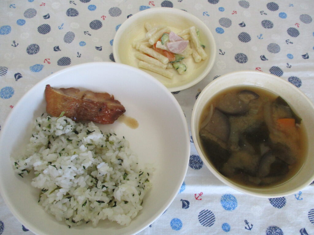 <今日の献立>菜飯・マカロニサラダ・赤魚みりん焼き・みそ汁