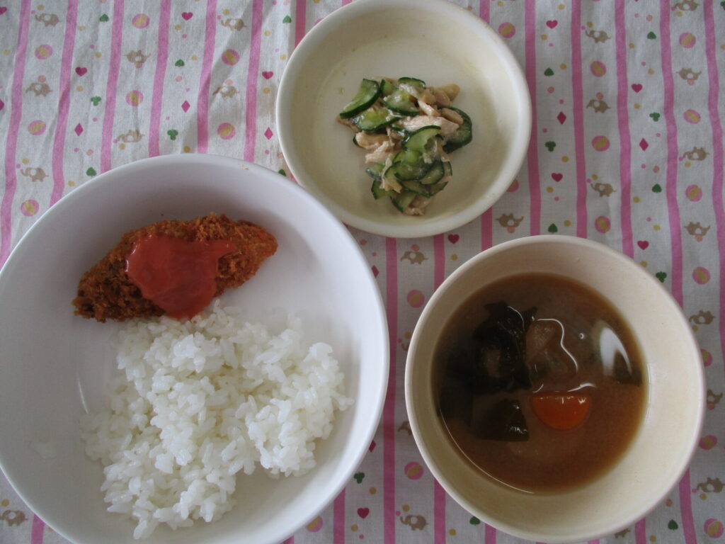 <今日の献立>白身魚のフライ・きゅうりとささみのサラダ・ごはん・みそ汁