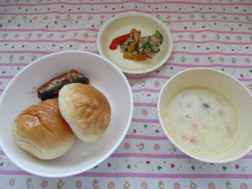 今日の献立♪パン、さんまトマト煮、野菜のマリネ、クラムチャウダー