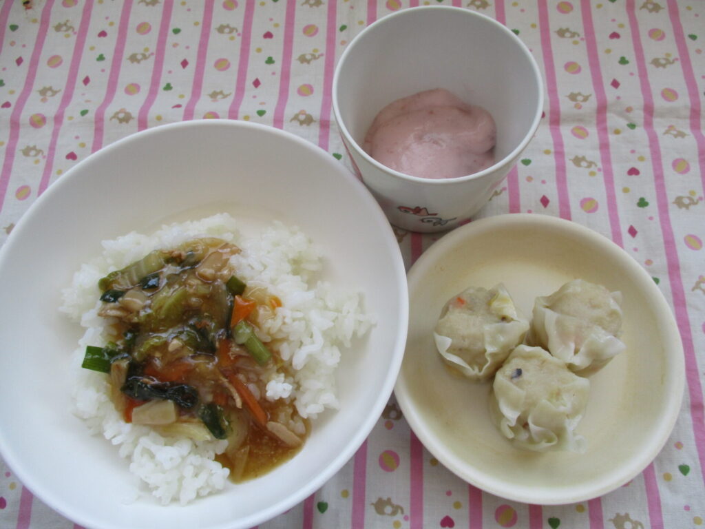 <今日の献立>中華丼・野菜シュウマイ・フルーチェ