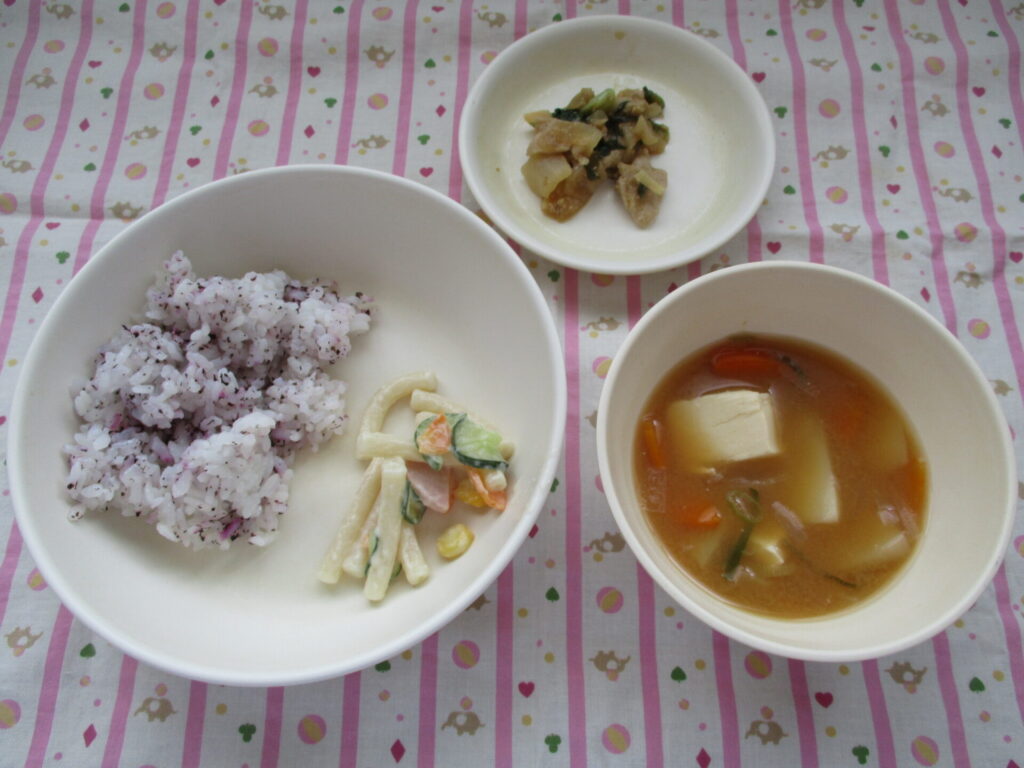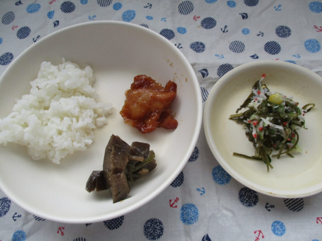 <今日の献立>ご飯・刻み昆布のサラダ・なすの味噌炒め・ミニ照り焼きチキン