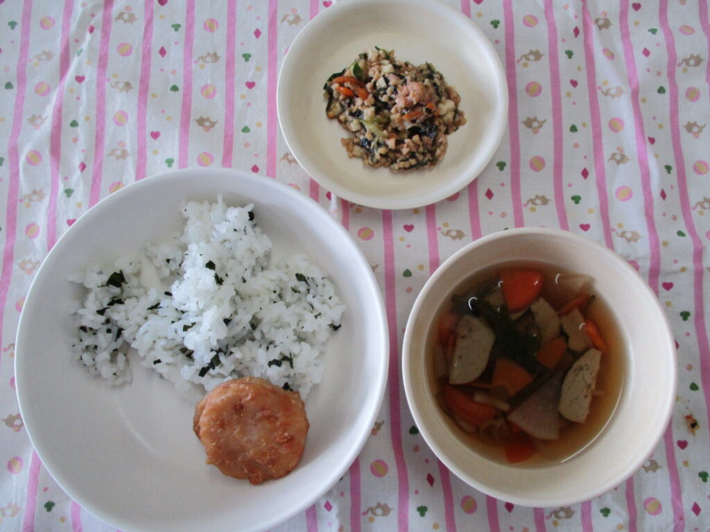 今日の献立✰わかめごはん、れんこんのはさみ揚げ、納豆サラダ、つみれ汁