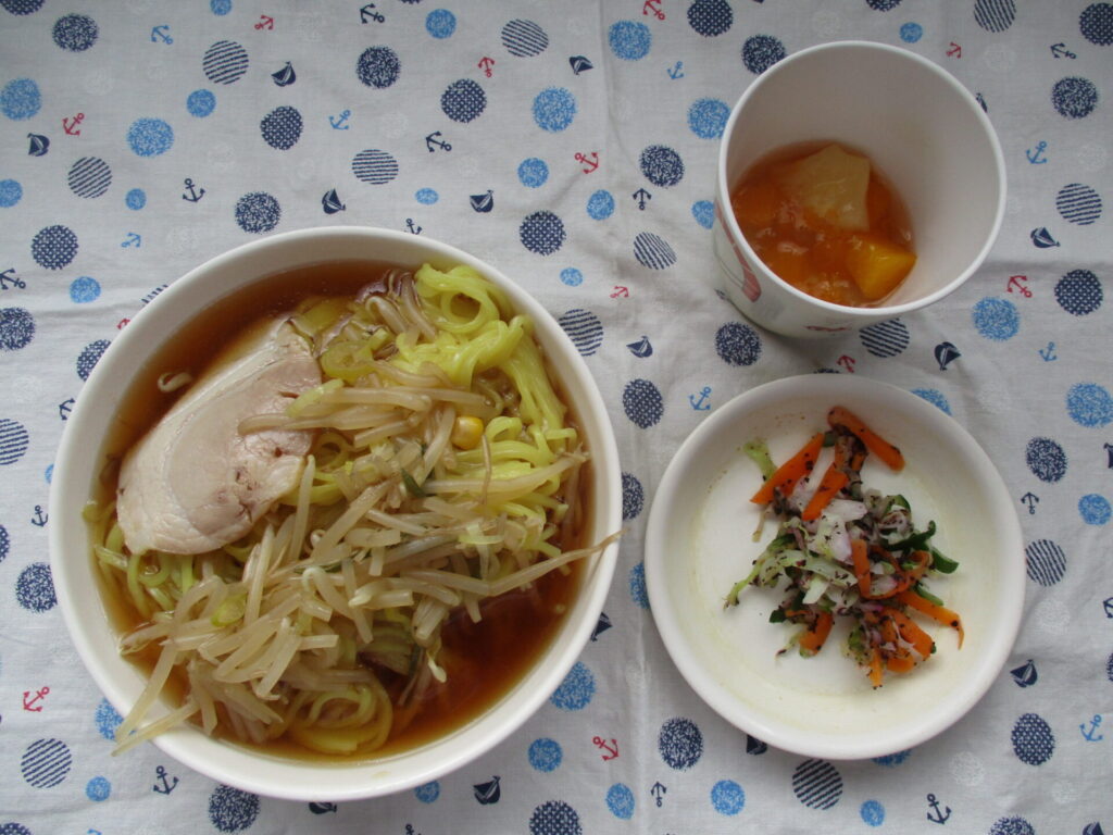 <6月23日のメニュー>醤油ラーメン・キャベツのゆかり和え・フルーツゼリー