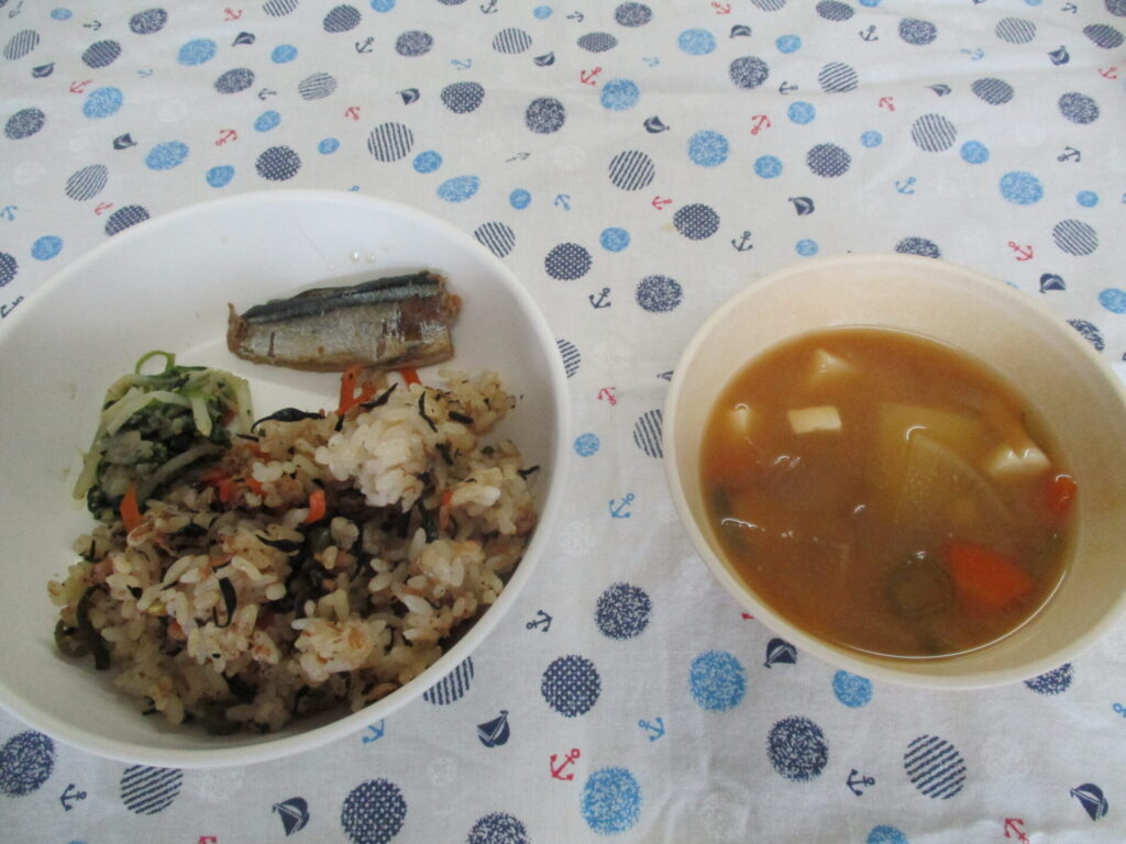 <今日の献立>ひじきごはん・野菜のごま和え・さんまの梅煮・味噌汁