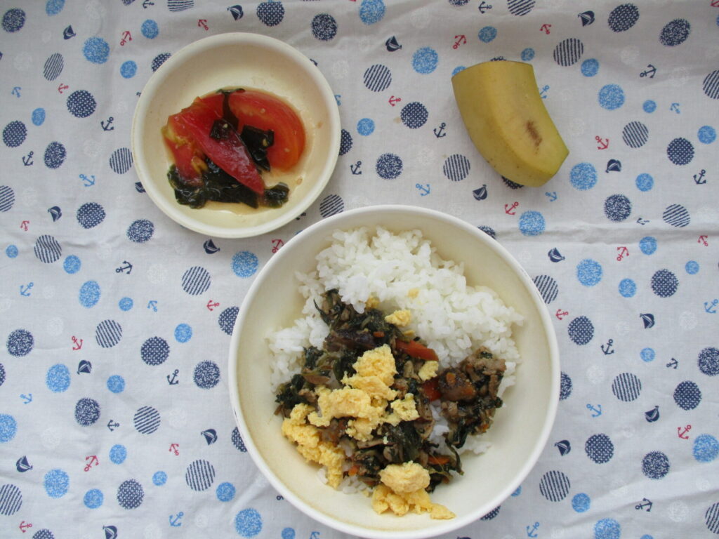 <今日の献立>ビビンバごはん・トマトとわかめのナムル・バナナ