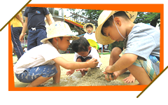 初夏から夏には裸足遊び・泥んこ遊びを楽しみ、土や泥の感触を味わいます。五感を刺激し、豊かな想像力や健康的な体を育んでいきます。また、園の近くには実習農園もあり、春はたまねぎ・じゃがいも、秋はさつまいもを収穫できます。保育の中でも、クラスで野菜などを育て、観察し、慈しむ心を育みます。子どもたちが自然に触れられる貴重な機会です。