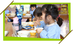 自園で作った温かい給食を準備し、 みんなで同じものを食べる楽しさを味わいます。収穫した野菜を使ったメニューもあり、 ふだん食べている食材が、たくさんのご苦労といのちのおかげさまであることに感謝の心を伝えていきます。