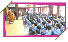 本園は真宗大谷派・専超寺の境内にある、歴史ある幼稚園です。 花まつりではお釈迦様のお誕生日を祝い手を合わせたり、夏の保育では本堂に上がり朝のおつとめをします。 境内にある緑の木々では、夏にせみとりを楽しみます。 春には桜が咲き、秋にはいちょうやもみじが色づき、季節の色を感じることができます。